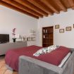 Dopo l’ingresso, si apre un ampio soggiorno con divano letto matrimoniale e TV. A completare la zona giorno troviamo anche una luminosa zona pranzo con tavolo e sedie: le due porte finestre del soggiorno portano infatti su un grazioso balcone dove è possibile rilassarsi e ammirare la vista della splendida chiesa di San Fermo Maggiore.