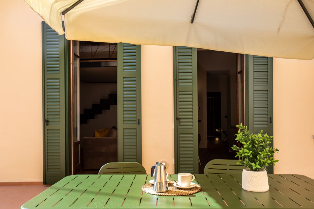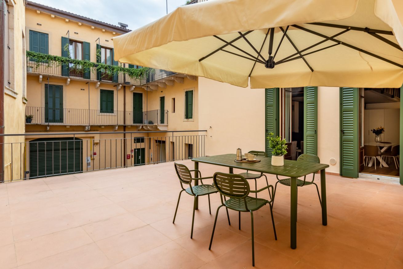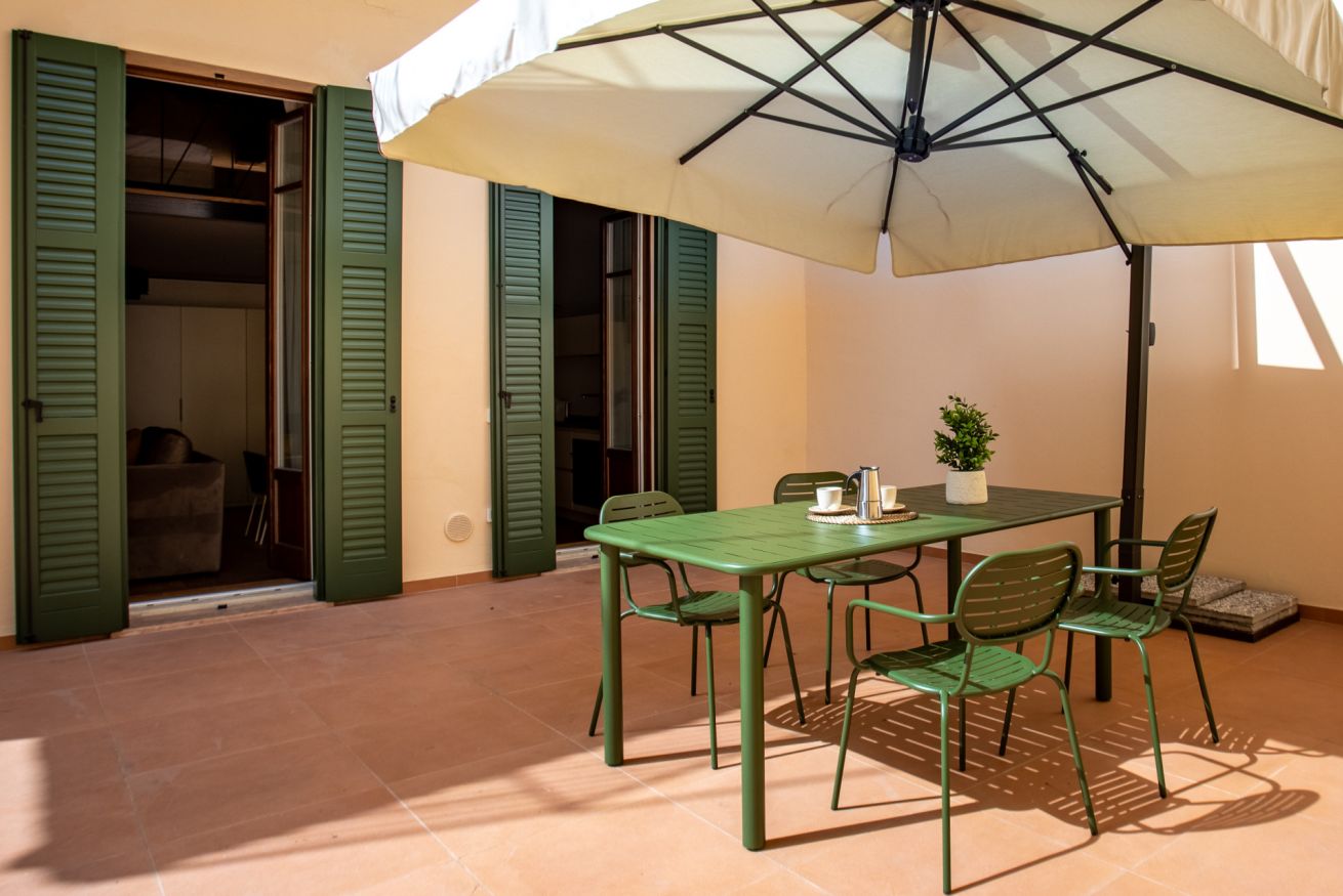 Perfetto per un soggiorno in famiglia o con amici l’appartamento è completato da un grande terrazzo privato a cui si accede dalle eleganti porte finestre del soggiorno. Affacciato sul cortile interno di Palazzo San Giorgio, l’ampio terrazzo è il luogo perfetto in cui godersi un’ottima cena all’aperto o leggere un buon libro gustando un bicchiere di vino.