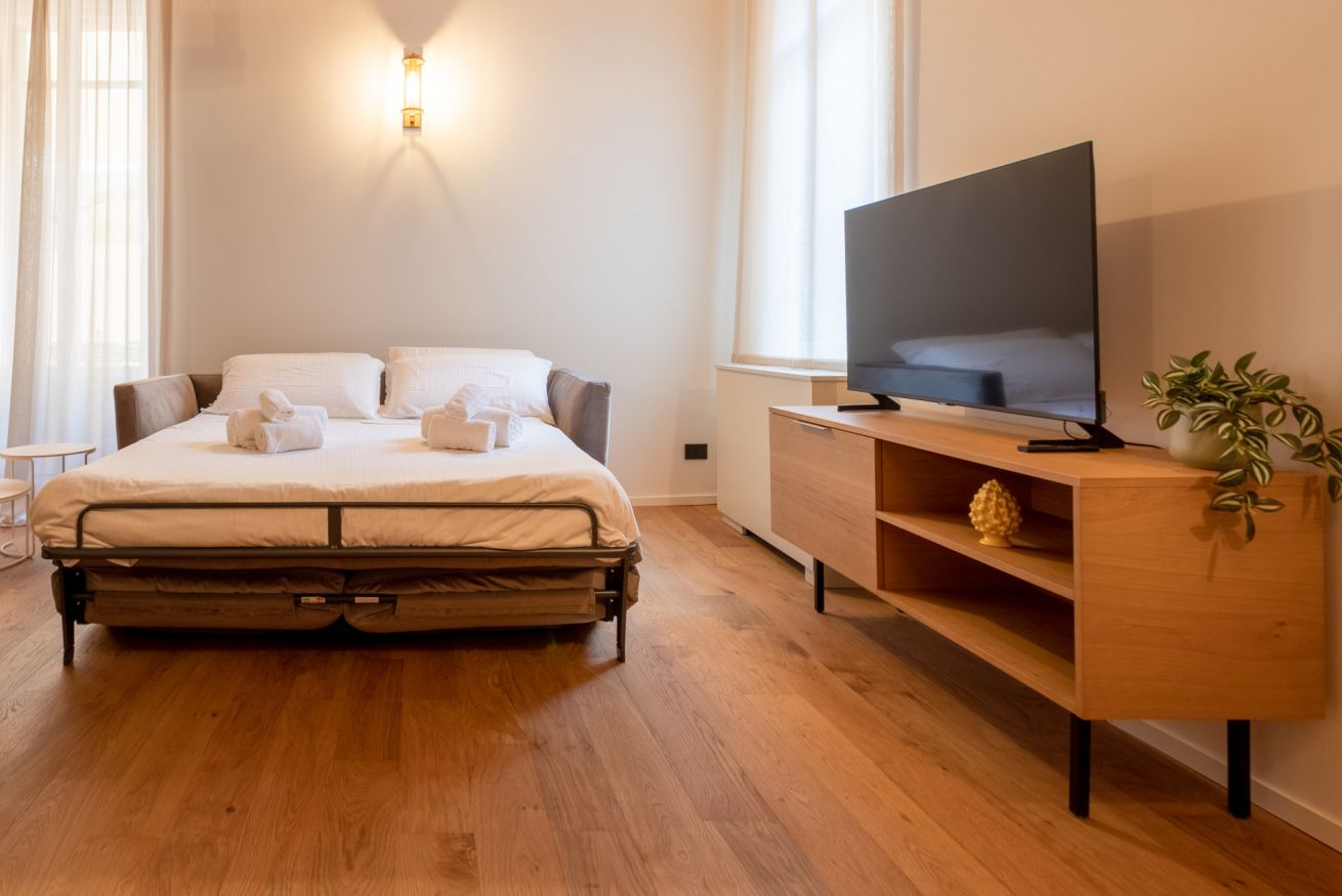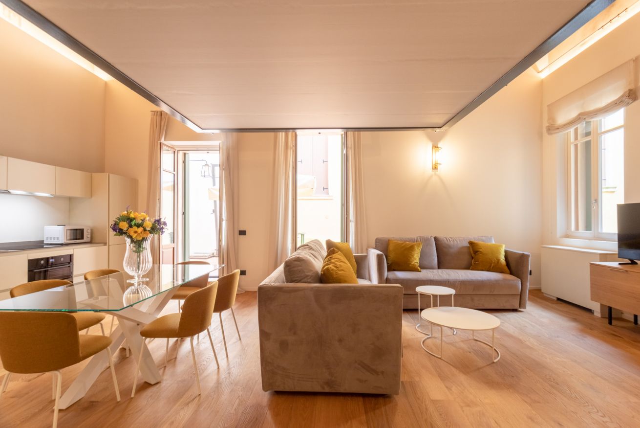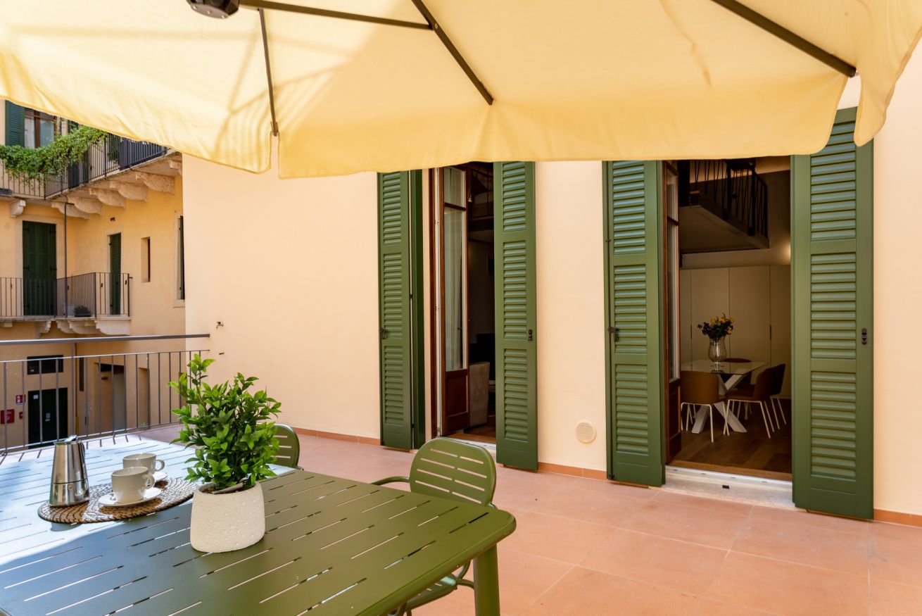 Perfetto per un soggiorno in famiglia o con amici l’appartamento è completato da un grande terrazzo privato a cui si accede dalle eleganti porte finestre del soggiorno. Affacciato sul cortile interno di Palazzo San Giorgio, l’ampio terrazzo è il luogo perfetto in cui godersi un’ottima cena all’aperto o leggere un buon libro gustando un bicchiere di vino.