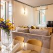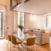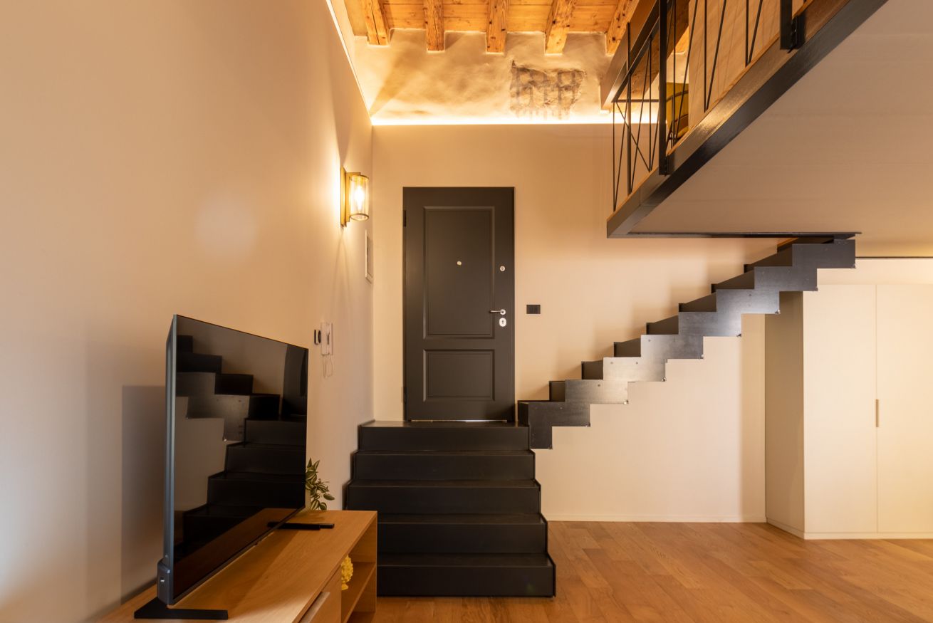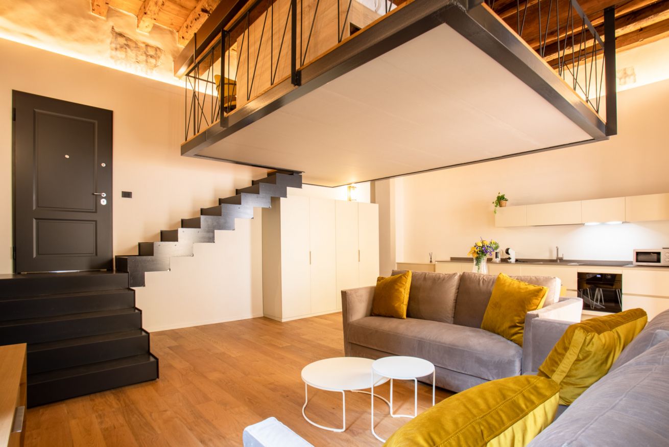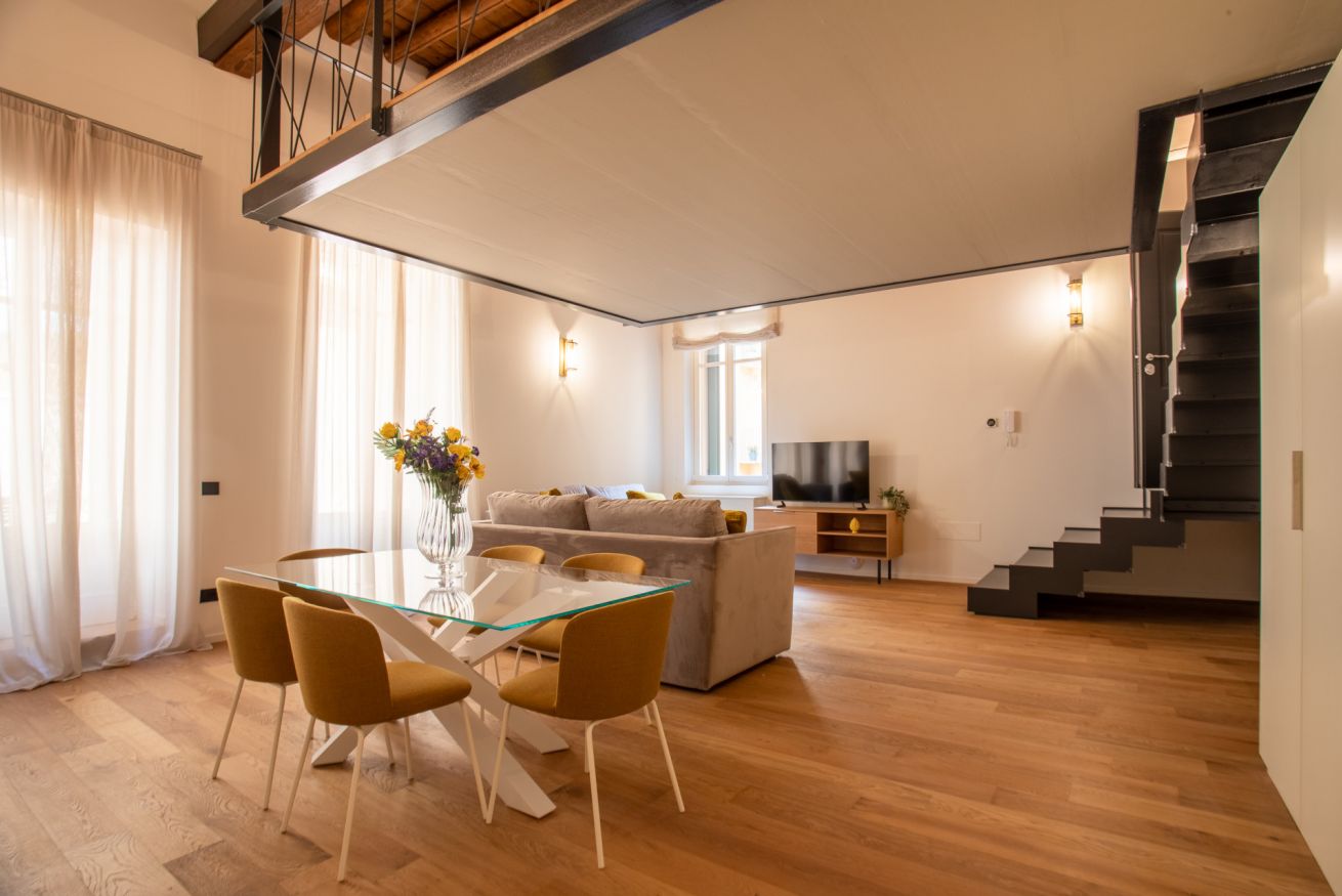 La luce naturale che inonda la zona giorno viene valorizzata dai toni degli arredi color senape, bianco e grigio che richiamano le tonalità degli affreschi del palazzo ed esaltano il contrasto tra la modernità del soppalco in ferro nero battuto e la storia che ancora oggi si respira in questa dimora.
