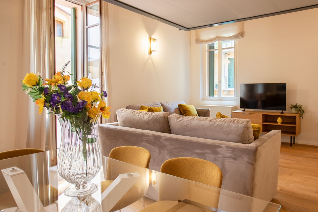 Le caratteristiche travi a vista e gli affreschi con motivo a finto vaio illuminati dai led nella parte superiore delle pareti e il parquet rispecchiano la storia dell’edificio contrastano armoniosamente lo stile moderno e contemporaneo dei mobili e della cucina di design, pensati per garantire ai nostri ospiti un soggiorno indimenticabile e con il massimo comfort nella meravigliosa città di Verona.