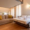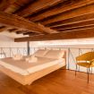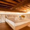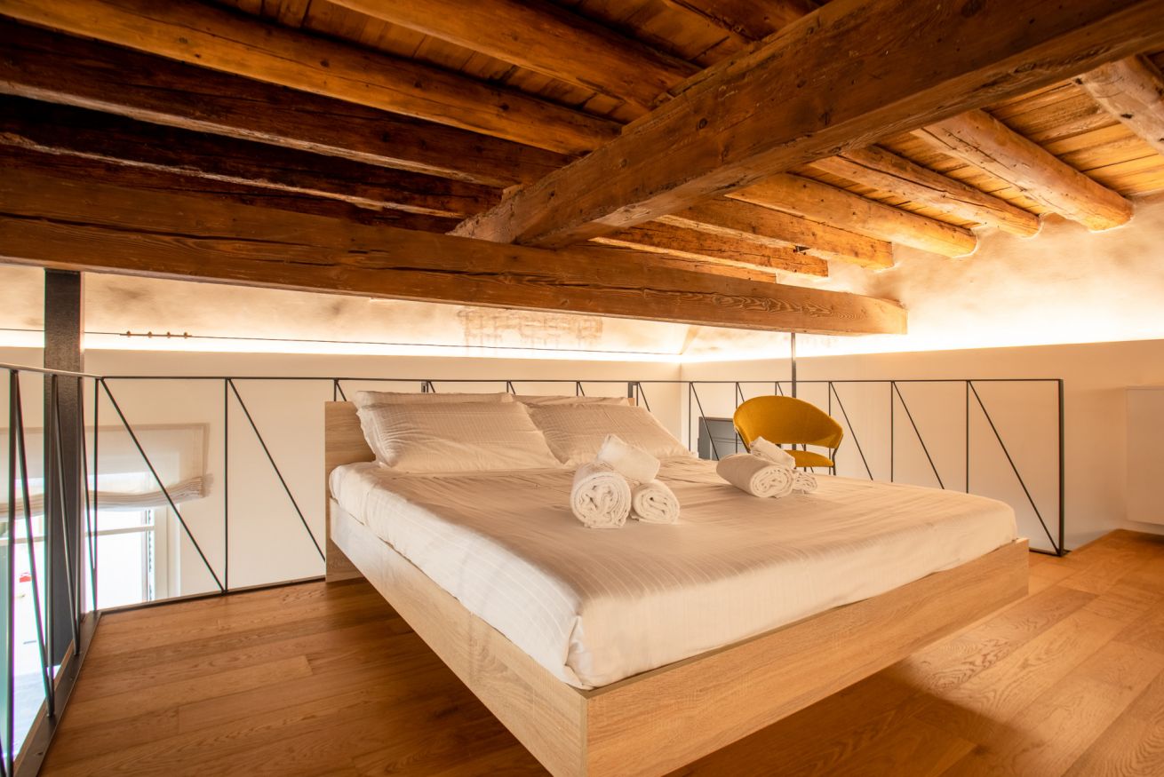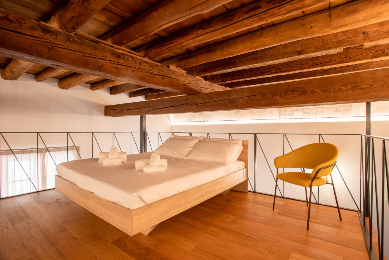 Qui si trovano un comodo letto matrimoniale, una poltroncina e dei comodini ed è possibile godere da vicino della bellezza delle travi a vista e degli affreschi nella zona superiore delle pareti decorata con chiusura di una decorazione con un motivo a finto vaio illuminati e valorizzati dalle luci dei led, affiancati alla fine ringhiera in stile geometrico del soppalco in un mix di pregio di storia e modernità.