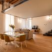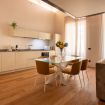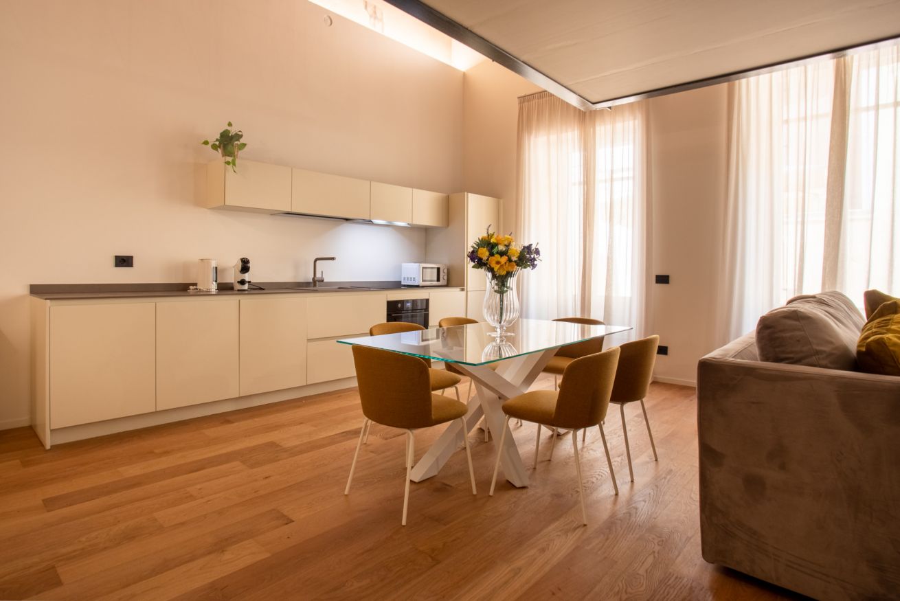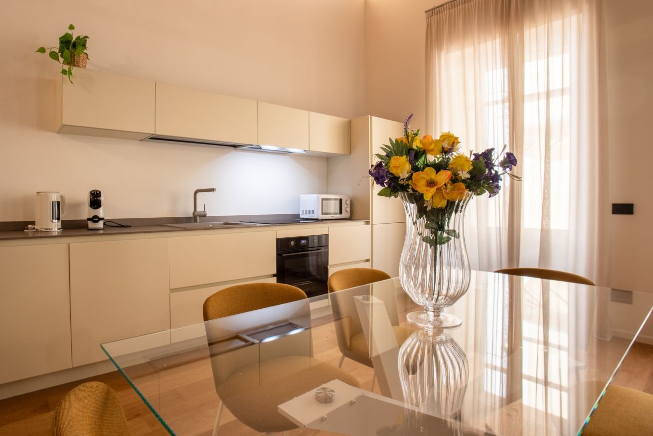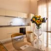 Alle spalle dei divani si trovano un’ampia cucina di design piena di luce naturale grazie alle grandi porte finestre e completamente attrezzata e dotata anche di microonde, lavastoviglie, bollitore e macchinetta per il caffè. La zona giorno open-space è completata da un elegante tavolo da pranzo in cristallo e un ampio armadio a quattro ante.