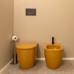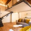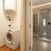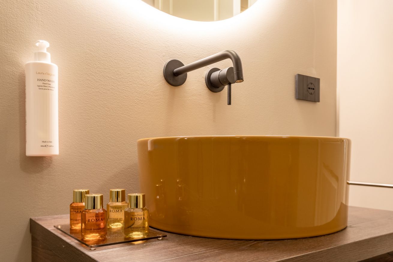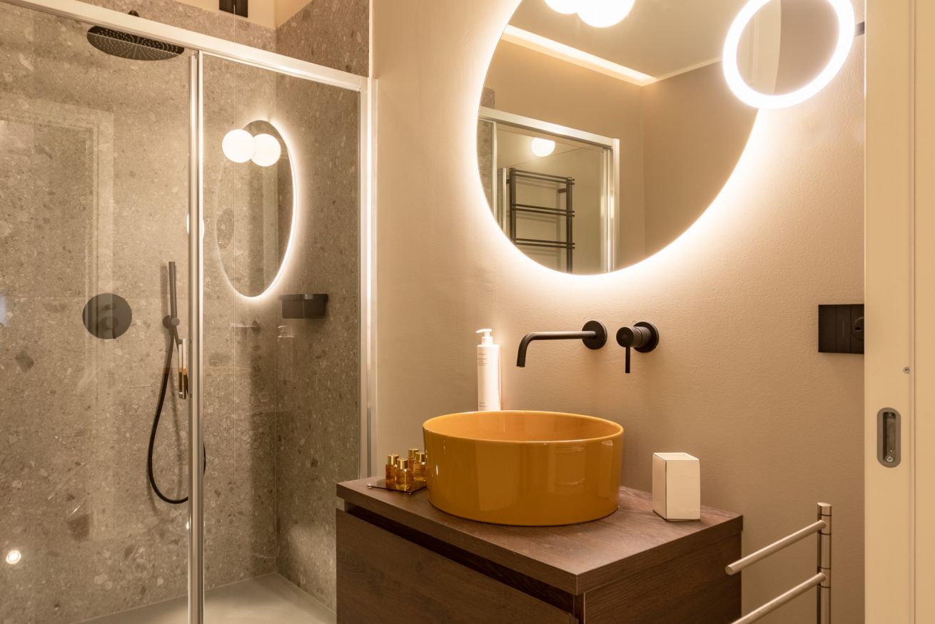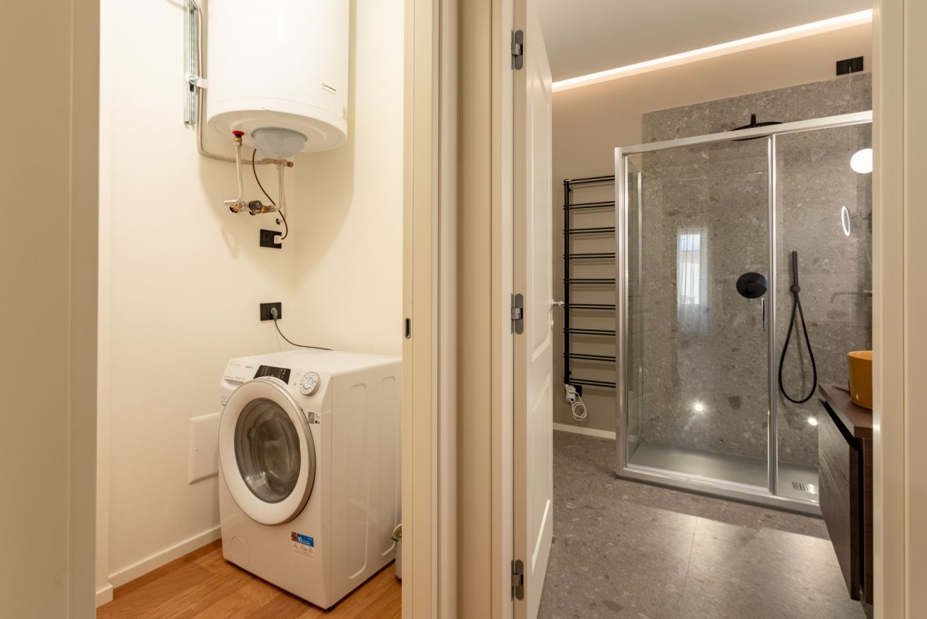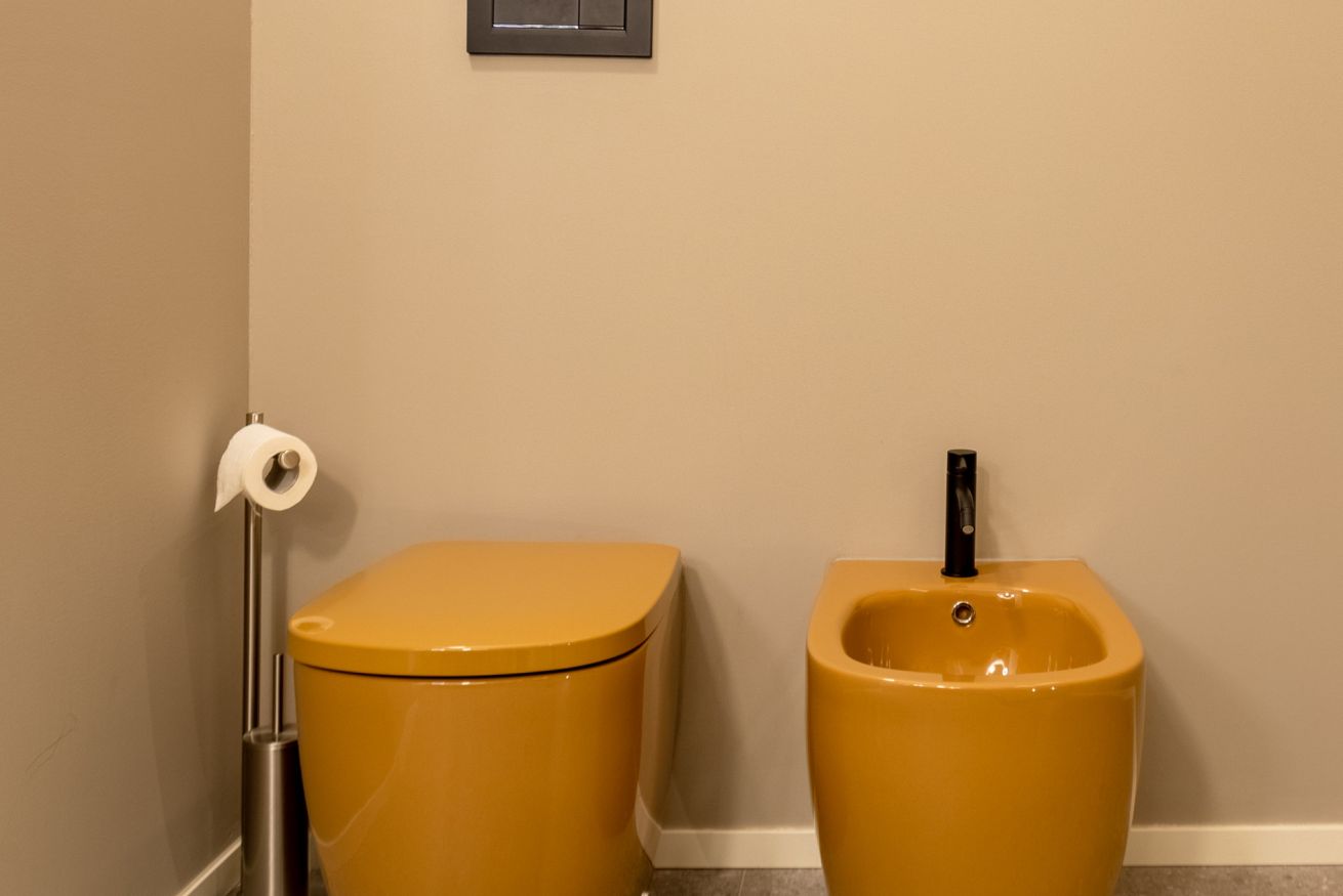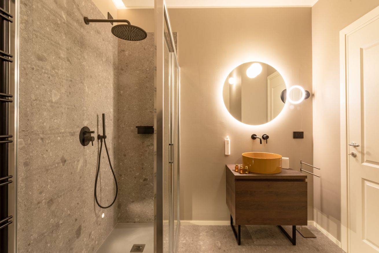 Un comodo bagno composto da un’ampia doccia e sanitari di design color senape e un ripostiglio lavanderia dotato di lavatrice completano il primo livello dell’appartamento, da cui partono le scale in ferro battuto nero che portano al soppalco sul piano superiore con la zona notte.