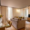 L’appartamento da 80 metri quadrati è situato al primo piano di Palazzo San Giorgio ed è raggiungibile in ascensore. Scesi un paio di gradini in ingresso, Dimora Rigoletto si apre su un luminoso soggiorno con una confortevole zona relax con due eleganti divani, uno dei quali può diventare un comodo divano letto, tavolino da caffè e smart TV.