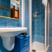 L’ingresso si apre su una caratteristica cucina blu con tavolo da pranzo coordinato, angolo cottura con il necessario per cucinare, forno, lavastoviglie e un ripostiglio dotato di lavatrice.