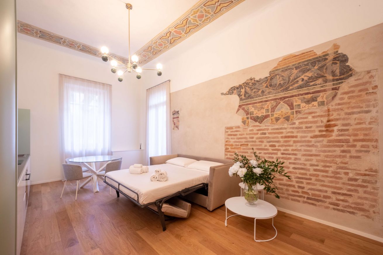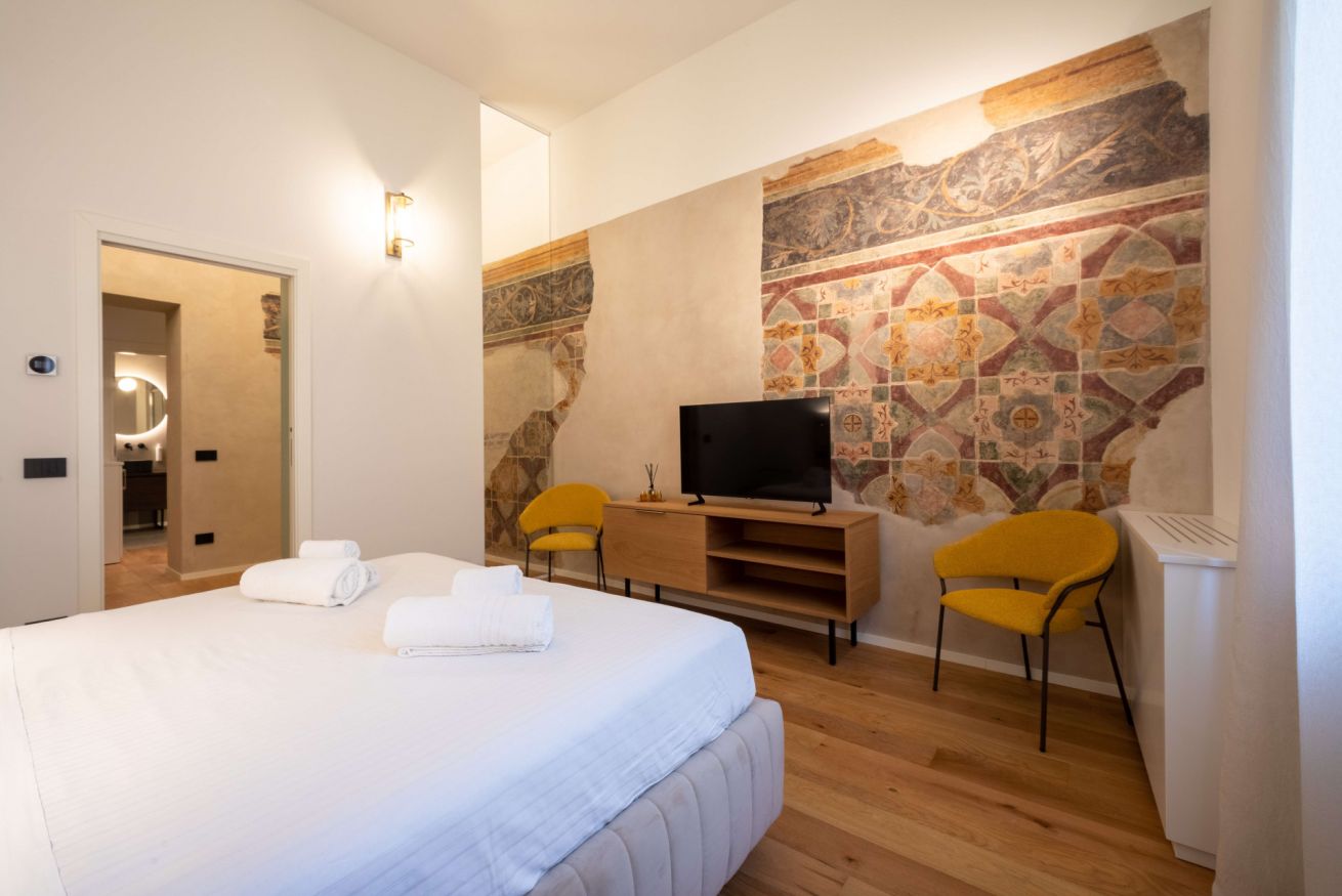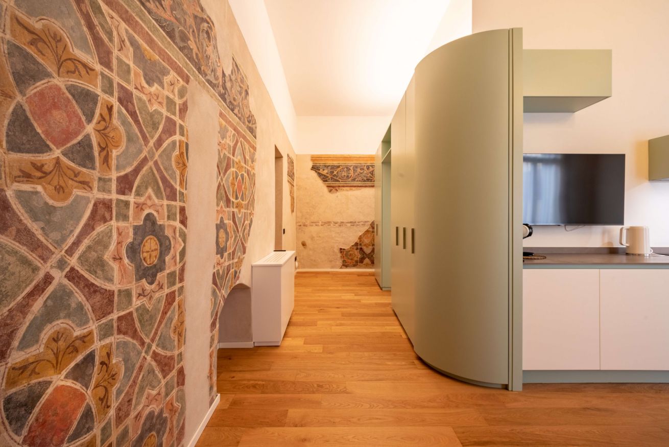 Gli affreschi risalenti alla seconda metà del XIV secolo con la loro complessa decorazione geometrica e floreale riproducono l’aspetto di stoffe preziose tipiche delle dimore cittadine dei nobili Scaligeri del tempo. La muratura medievale con ciottoli di fiume ben ordinati, le caratteristiche nicchie, il soffitto affrescato e il parquet si trovano in un armonioso contrasto con i mobili moderni e di design contemporaneo, pensati per garantire ai nostri ospiti un soggiorno indimenticabile e con il massimo comfort nella meravigliosa città di Verona.