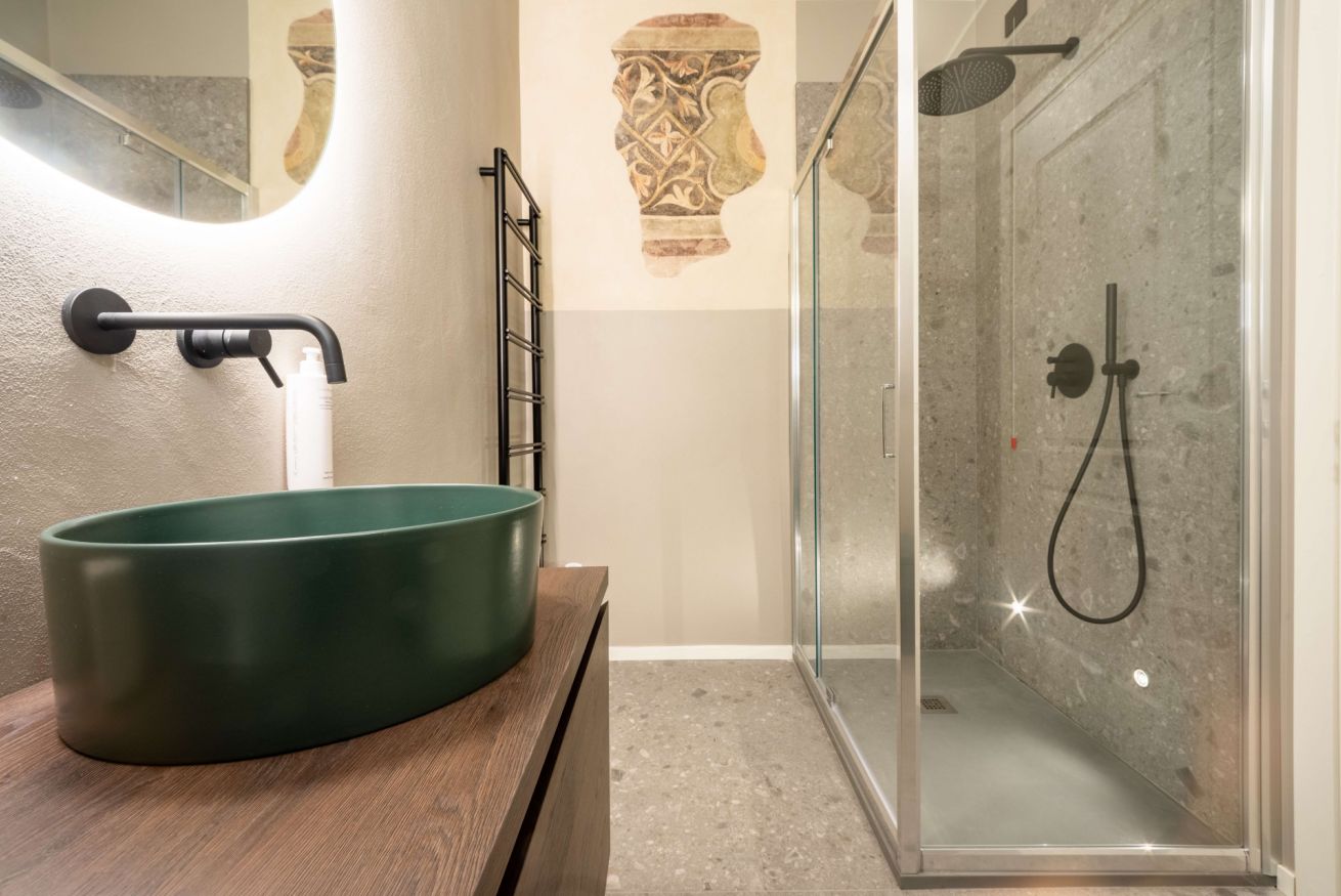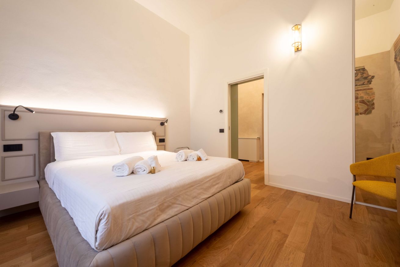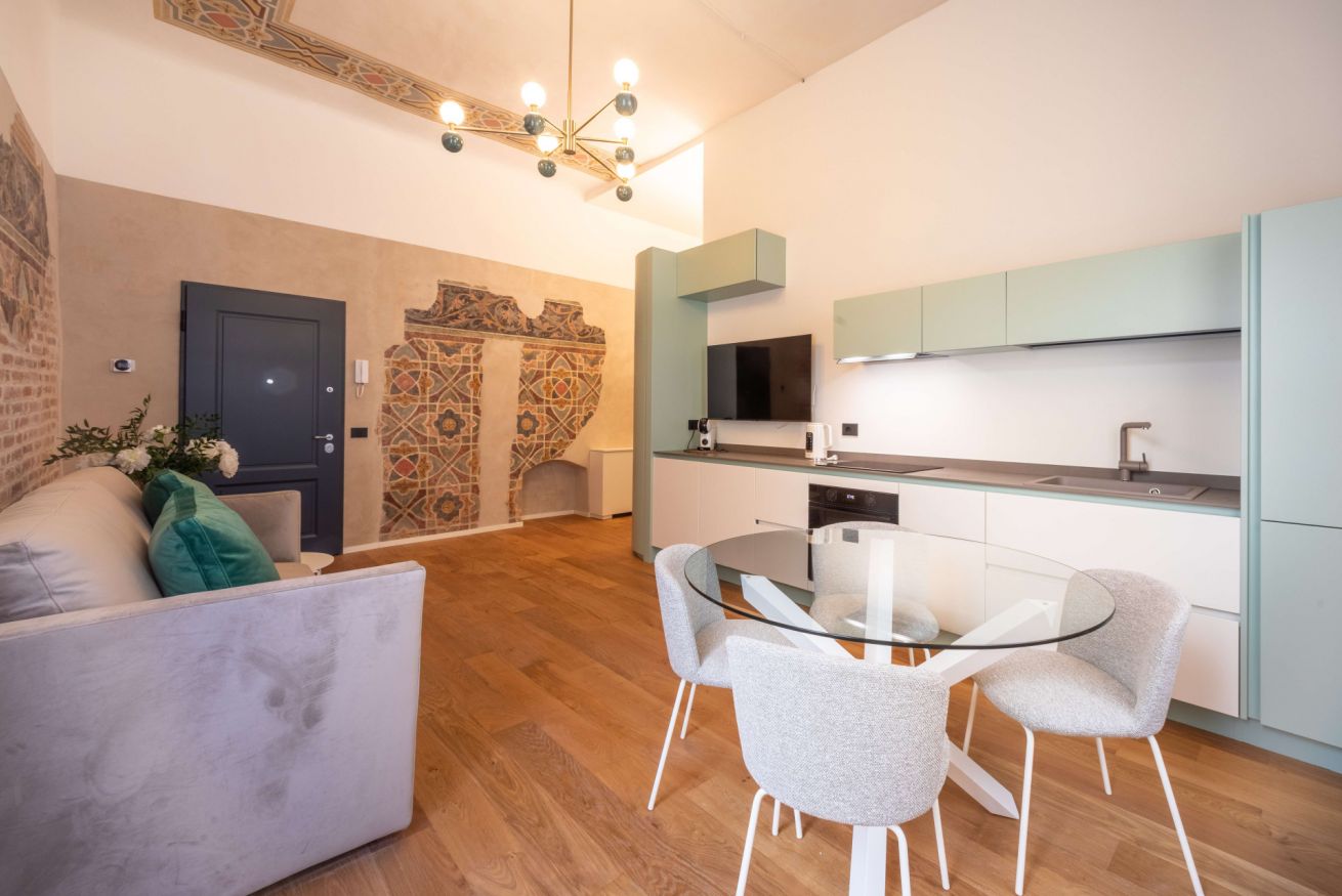 Gli affreschi risalenti alla seconda metà del XIV secolo con la loro complessa decorazione geometrica e floreale riproducono l’aspetto di stoffe preziose tipiche delle dimore cittadine dei nobili Scaligeri del tempo. La muratura medievale con ciottoli di fiume ben ordinati, le caratteristiche nicchie, il soffitto affrescato e il parquet si trovano in un armonioso contrasto con i mobili moderni e di design contemporaneo, pensati per garantire ai nostri ospiti un soggiorno indimenticabile e con il massimo comfort nella meravigliosa città di Verona.