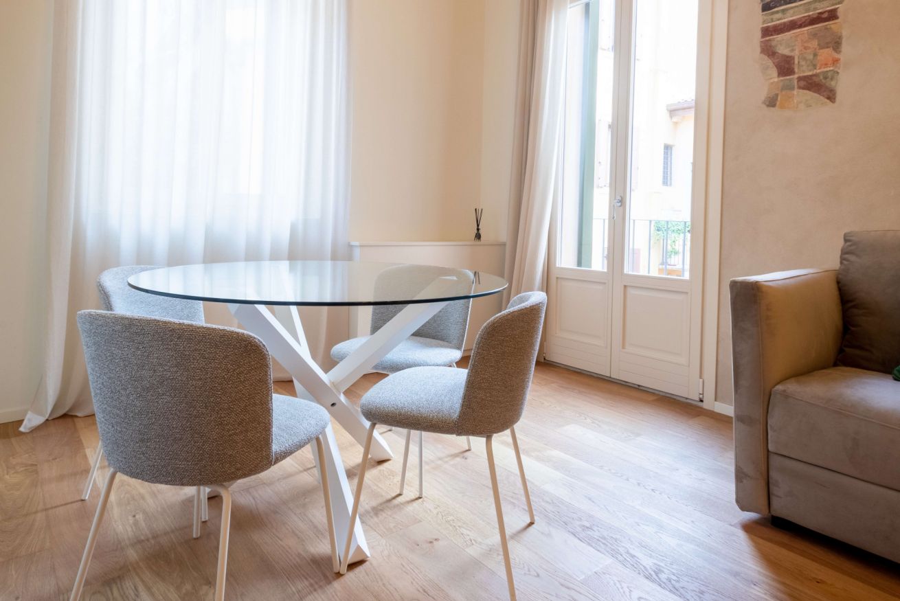 Perfetto per un soggiorno in famiglia o con amici l’appartamento è dotato anche di un balcone privato a cui si accede dall’elegante porta finestra del salotto che affaccia sulla corte interna del palazzo e dove gustare un calice di vino all’aria aperta.