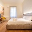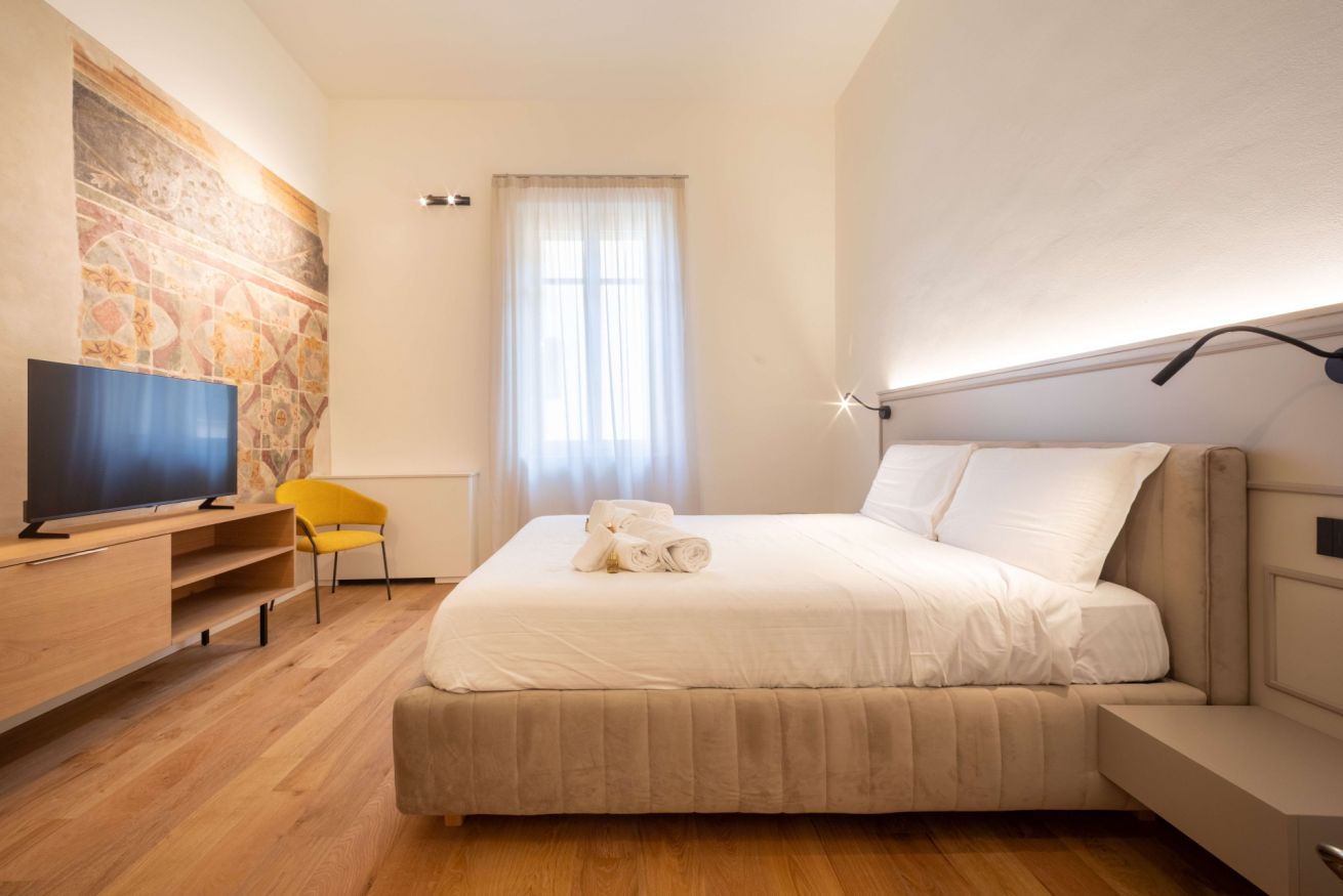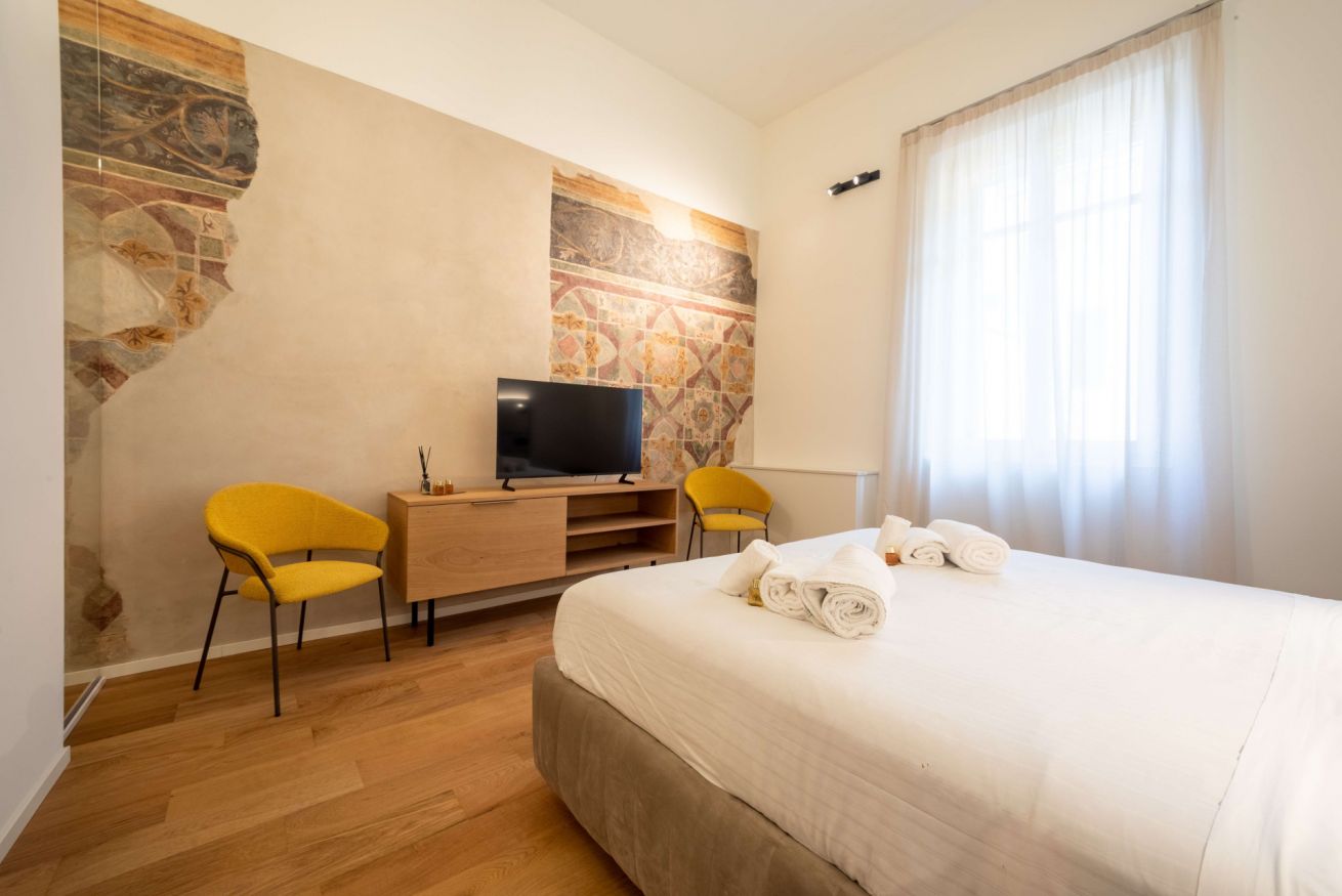 Il corridoio affrescato e con ampia armadiatura conduce alla luminosa camera matrimoniale dotata di poltroncina e smart Tv alle cui spalle si trovano alcuni degli affreschi più notevoli della dimora.