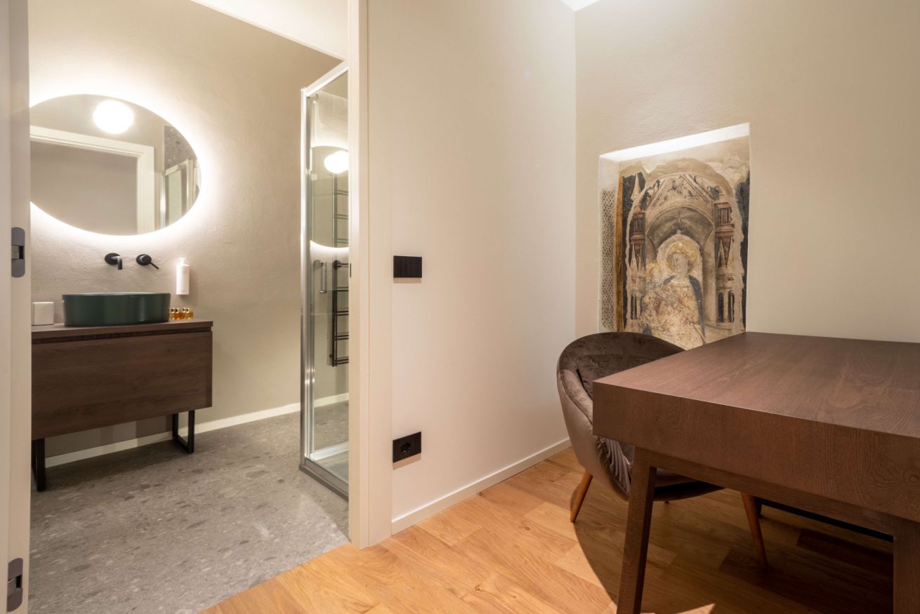 Una delle chicche di questo appartamento è la nicchia che si trova prima del bagno, in cui è posizionata una comoda scrivania e in cui si trova una splendida figura di Madonna con bambino in trono risalente al 1380 circa.