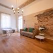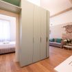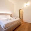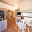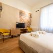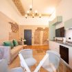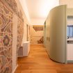L’appartamento da 80 metri quadrati è situato al secondo piano di Palazzo San Giorgio ed è raggiungibile in ascensore ed è decorato su 3 lati con un’elegante composizione geometrica di linee chiare intersecate dai toni dell’azzurro, rosso, verde e giallo per comporre una fioritura arabesca. Il luminoso salotto è arredato con un elegante divano, che può diventare un comodo divano letto, la smart Tv e un’ampia cucina di design completamente attrezzata e dotata anche di microonde, lavastoviglie, bollitore e macchinetta per il caffè.