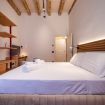 L’accogliente camera da letto matrimoniale è interamente arredata con pregiati mobili in legno nelle stesse tonalità del parquet e nei toni caldi del bordeaux che richiamano i decori delle travi a vista creando un ambiente accogliente e romantico.
