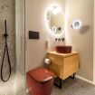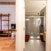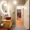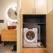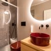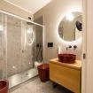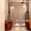 Un breve corridoio conduce al bagno composto da un’ampia doccia e sanitari di design color bordeaux e con un armadio ripostiglio dotato di lavatrice situato nell’antibagno.