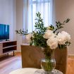 L’appartamento da 55 metri quadrati è situato al primo piano di Palazzo San Giorgio ed è raggiungibile in ascensore. Dimora Violetta si apre su un luminoso e ampio soggiorno con una confortevole area relax con poltrona e divano, che può diventare un comodo divano letto, tavolini da caffè, smart TV e una pregiata libreria in legno.