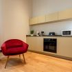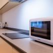 La parete destra del soggiorno è dedicata all’ampia cucina di design completamente attrezzata e dotata anche di microonde, lavastoviglie, bollitore e macchinetta per il caffè. La zona giorno open-space è completata da un elegante tavolo da pranzo in cristallo.
